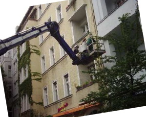 Die Haftwurzeln von Wein und Efeu haften nur auf der Oberfläche und dringen nicht tief in den Putz ein, wenn der Putz unbeschädigt und das Mauerwerk nicht feucht ist. Am beschädigten, feuchten Putz und feuchtem Mauerwerk bilden sich unter Umständen jedoch nicht nur oberflächlich anhaftende Wurzeln sondern auch stärkere Wurzeln, die der Wasser- und Nährstoffaufnahme dienen. Diese Wurzeln sind dann sehr wohl in der Lage, einen bereits bestehenden Schaden beschleunigt zu vergrößern. Im Bild wird ein solcher Fall gezeigt: Entlang eines leicht beschädigten und undichten Fallrohres wuchs ein Knöterich (der jedoch keine Haftwurzeln bildet) bis zur Dachrinne hinauf. An den Stellen, an denen die Hauswand häufig feucht war, bildete die Pflanze Wurzeln, die in den feuchten Putz eindrangen und diesen vom Mauerwerk lösten (eine solche Stelle ist ca. 2 m oberhalb des Fahrkorbes sichtbar). An einer Stelle an der das Fallrohr beschädigt war, bildete der Knöterich ein dichtes Wurzelgeflecht in das Fallrohr hinein.